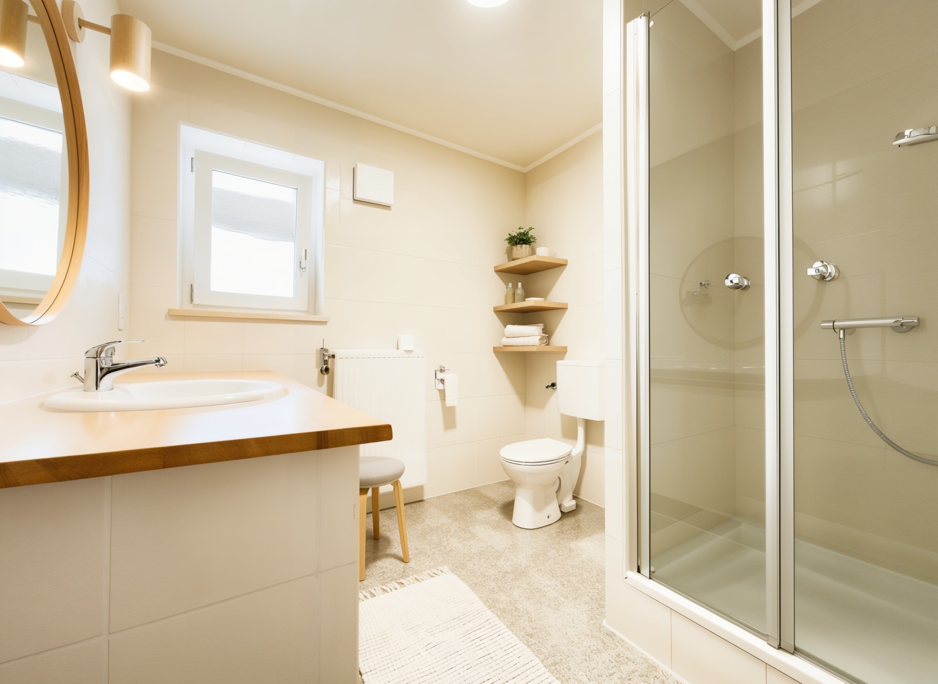 - Badausstattung: Dusche, Badewanne, Fenster