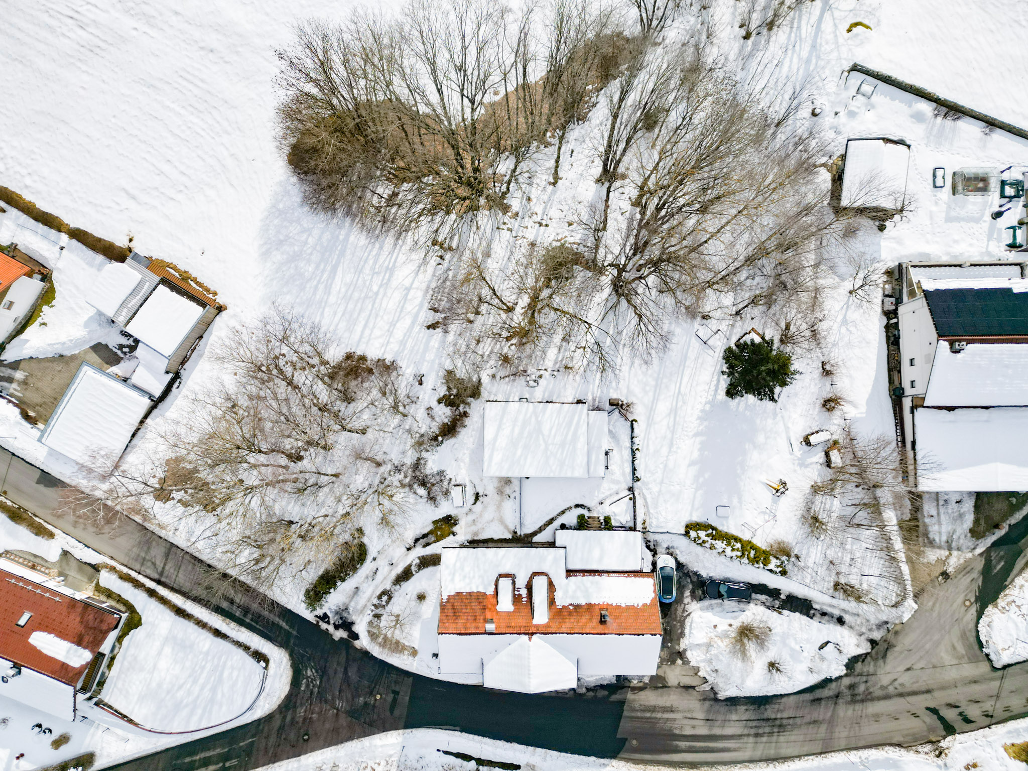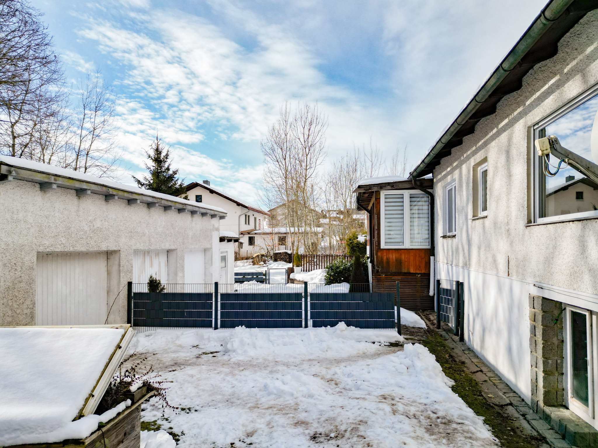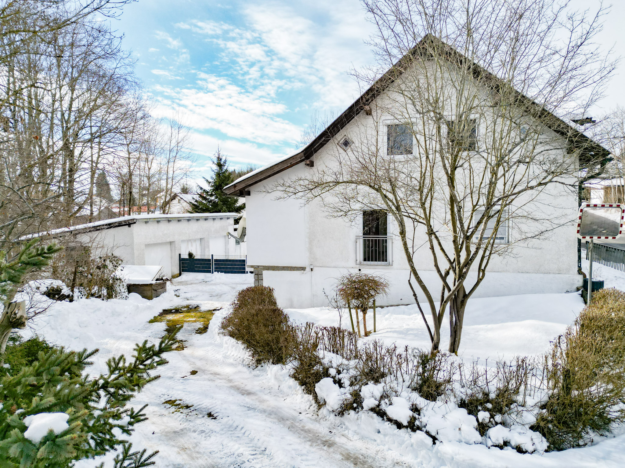 Das beeindruckende Grundstück mit 2.409 m² bietet viel Platz für Garten, Freizeit und Rückzug. Zwei mögliche Zufahrten, eine massive Dreifachgarage, zusätzliche Stellplätze sowie Werkstatt- und Lagerflächen im Garagenbereich und im teilunterkellerten Haus machen das Anwesen auch funktional außergewöhnlich stark.