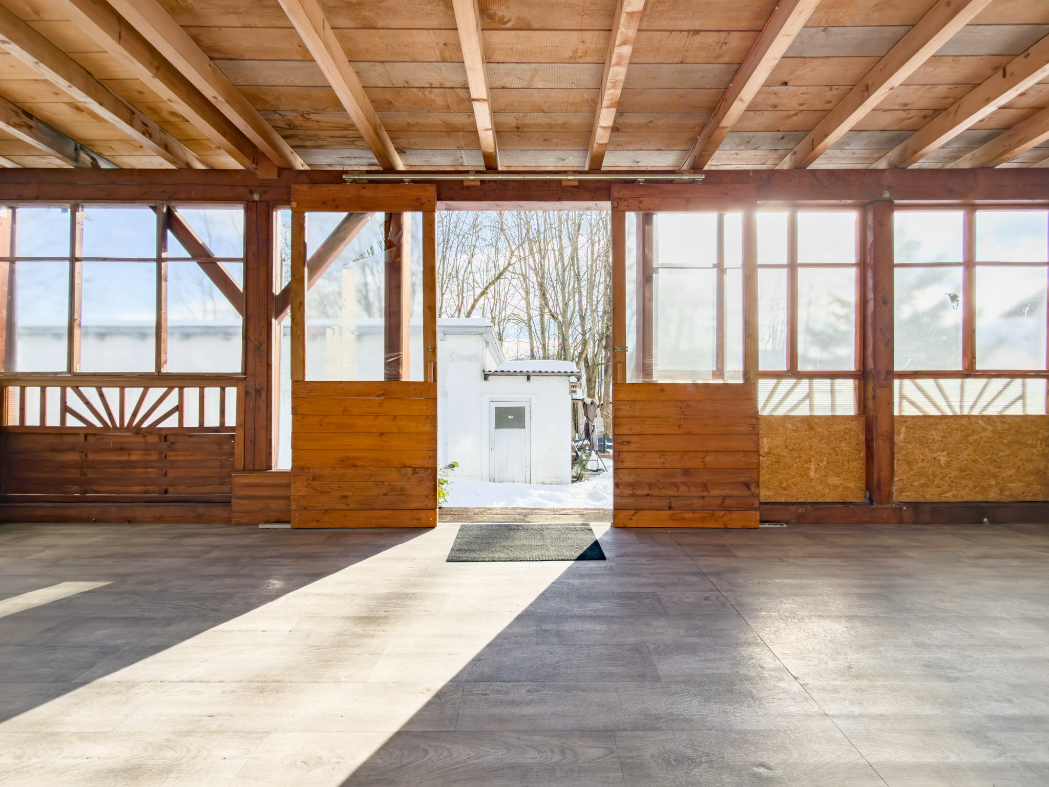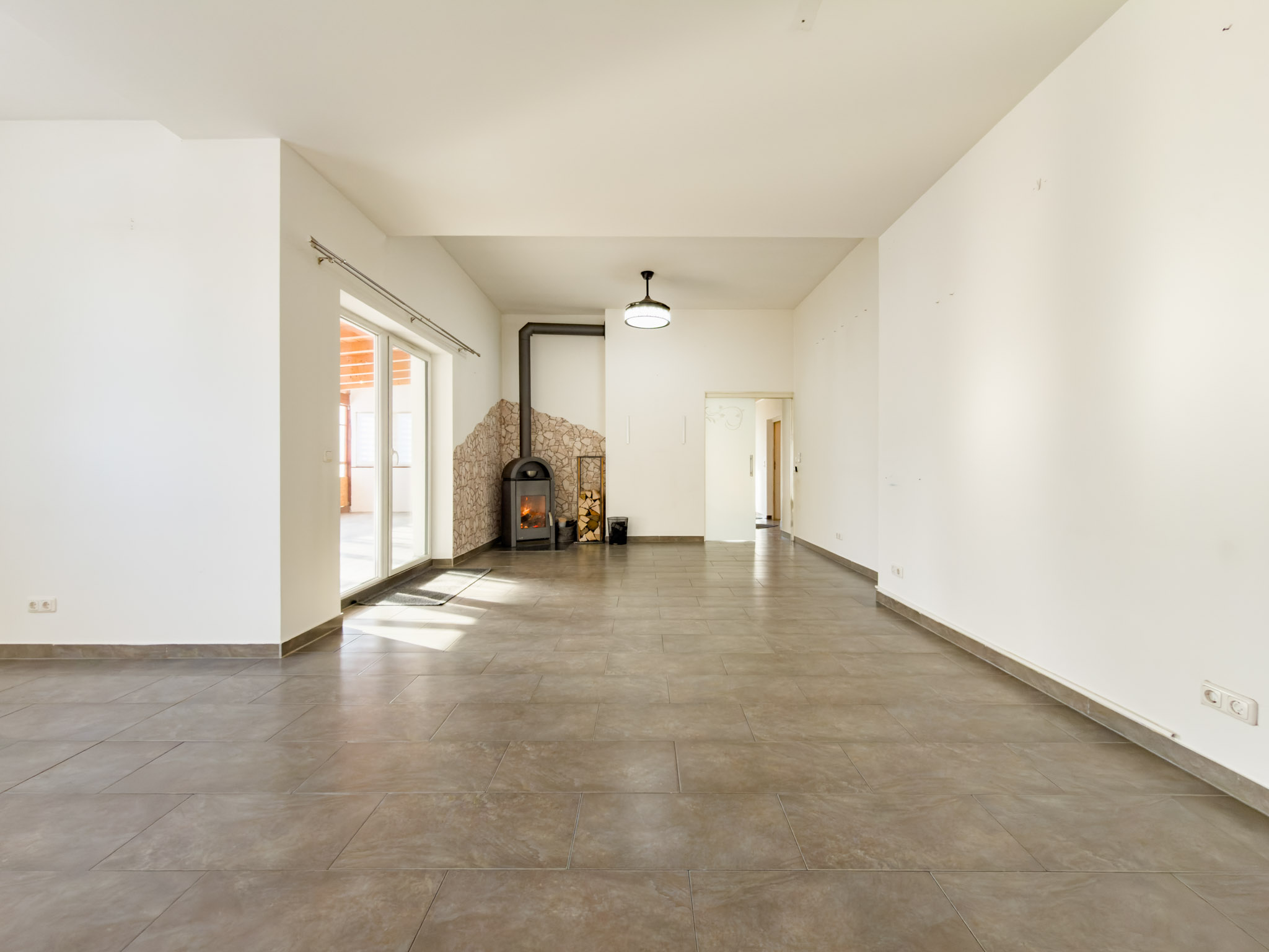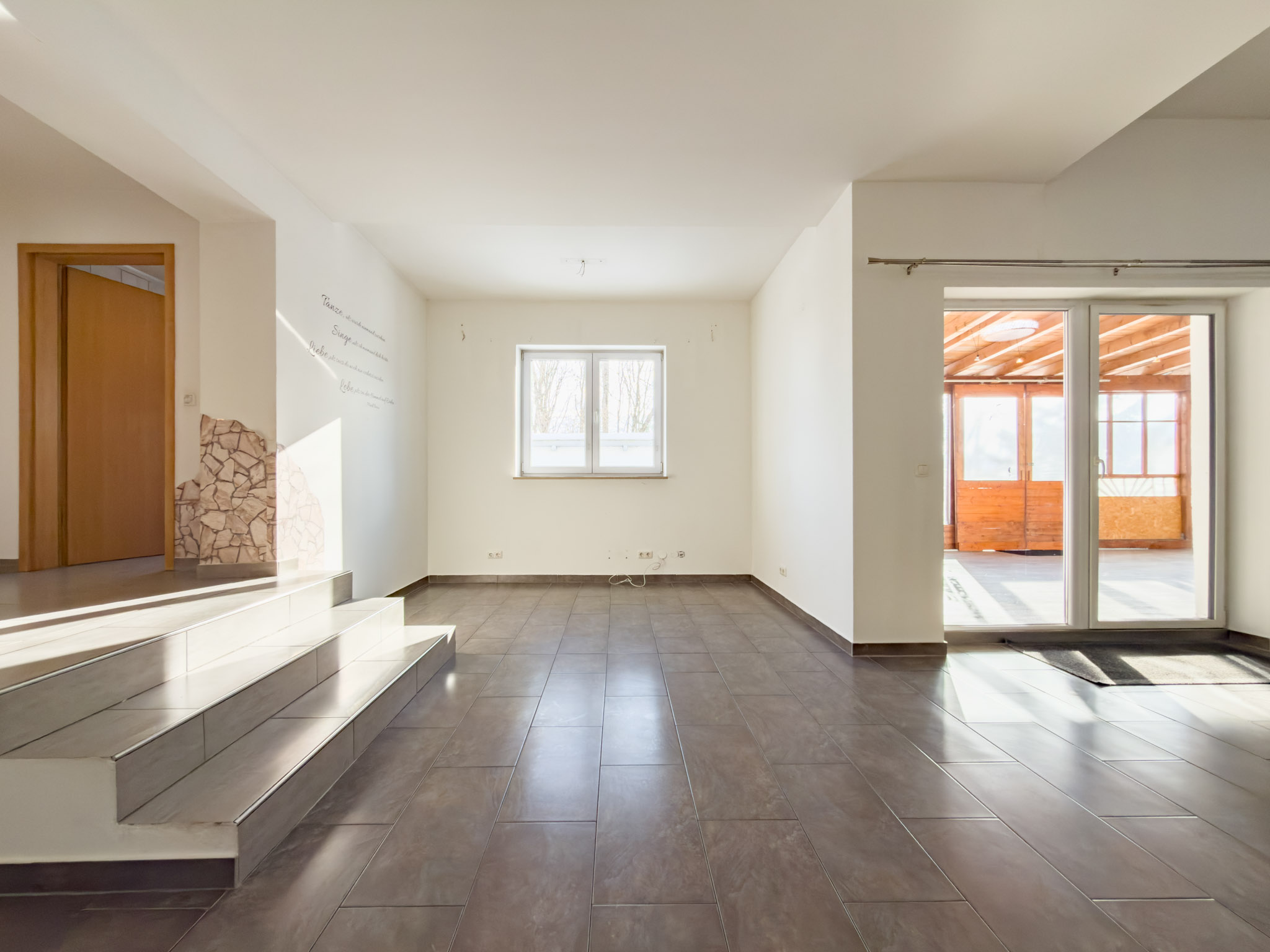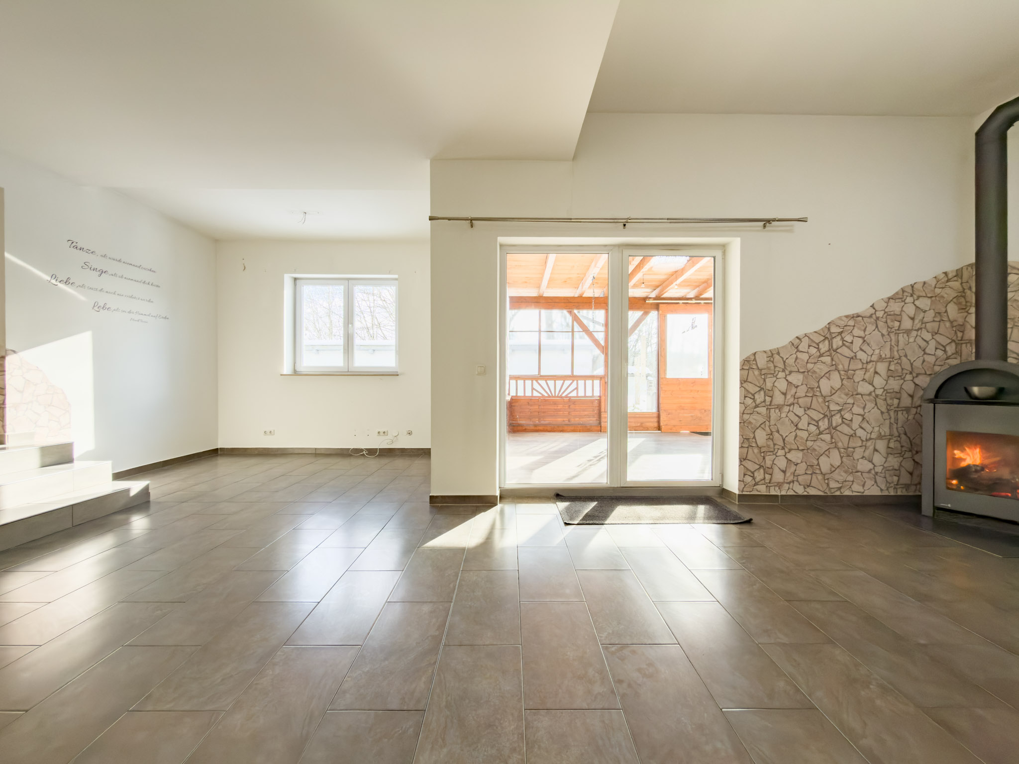 – Wohnzimmer mit Kaminofen und Zugang zur überdachten Terrasse bzw. Wintergarten