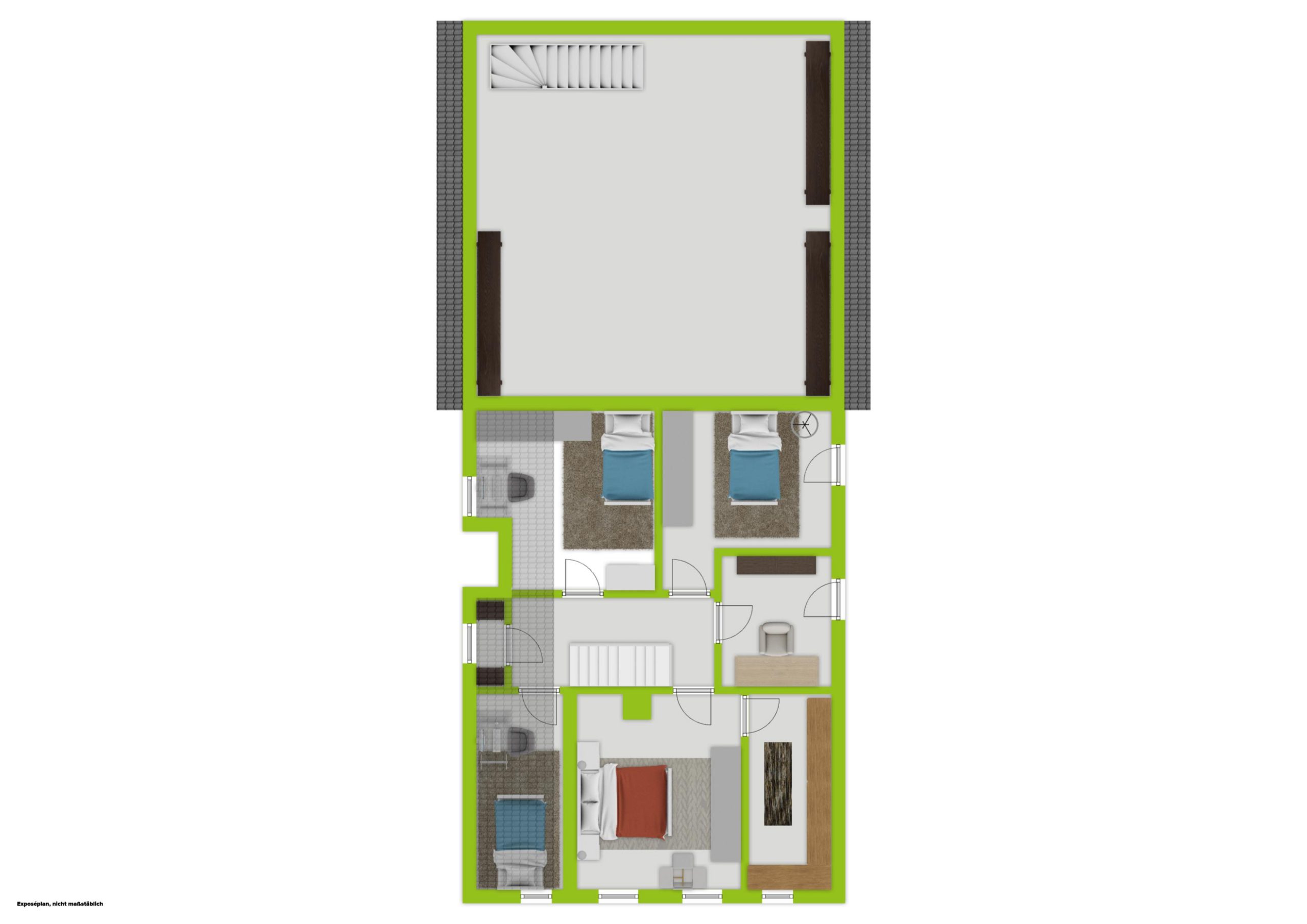 Im Dachgeschoss warten drei gut geschnittene Zimmer, die sich ideal als Kinder- oder Hobbyzimmer eignen, sowie zwei zusätzliche Räume, die sich hervorragend als Büro oder Gästezimmer anbietet. Abstellflächen in den Dachschrägen sorgen dafür, dass Stauraum kein Thema ist – gerade im Familienalltag ein nicht zu unterschätzender Vorteil.