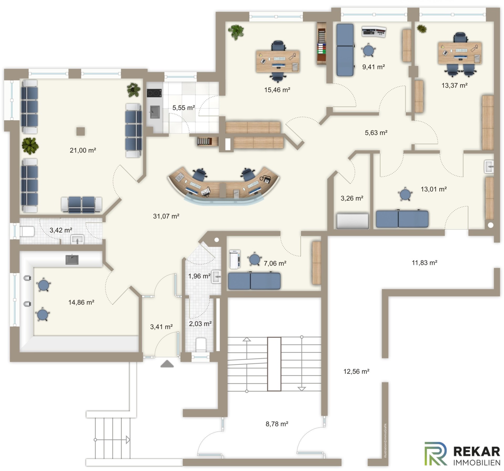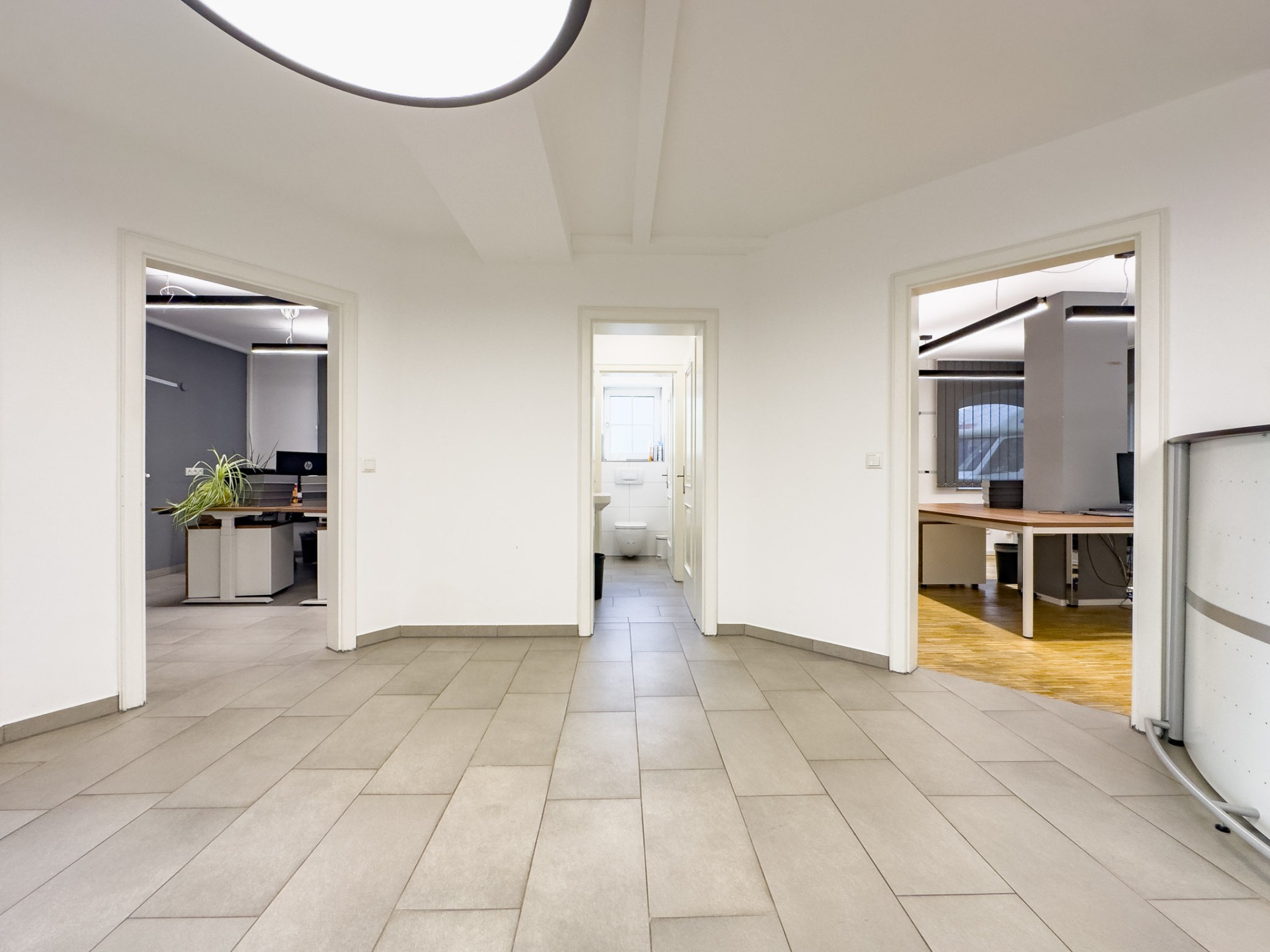 Durch ihre flexible Aufteilung und die hochwertige Ausstattung ist diese Fläche perfekt geeignet für Büros aus den Bereichen Architektur, Steuerberatung, Versicherung, Unternehmensberatung oder Ingenieurwesen ebenso wie für Praxen aus den Bereichen Physiotherapie, Psychologie oder Ergotherapie.