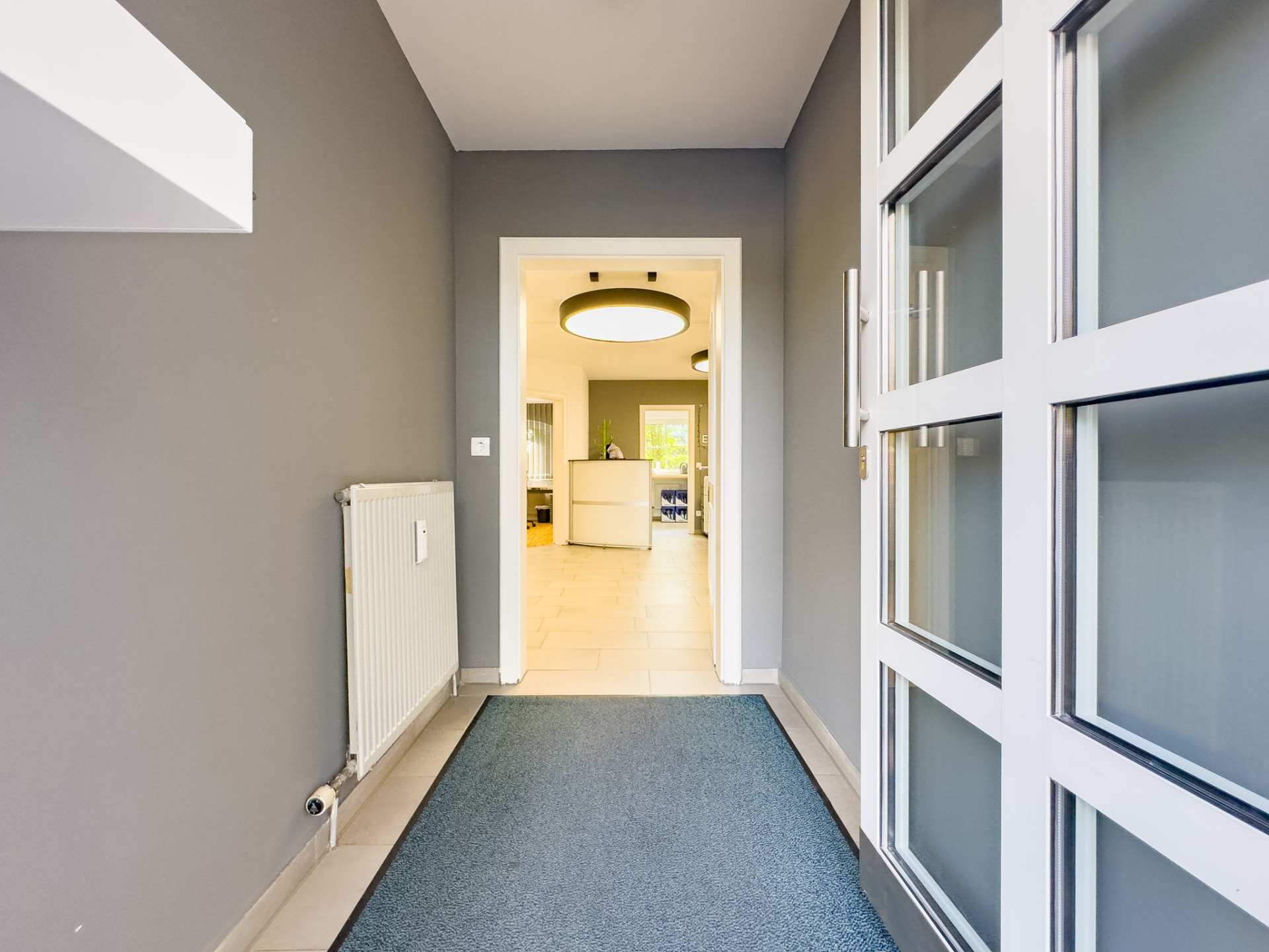 Mit rund 147 m² Fläche bietet die Einheit genügend Raum für verschiedene Nutzungskonzepte. Dank der barrierefreien Zugänglichkeit über den eigenen Außeneingang – alternativ auch über das Treppenhaus erreichbar – eignet sie sich besonders gut für Dienstleister mit regelmäßigem Kunden- oder Patientenverkehr. Der großzügige Empfangsbereich schafft einen einladenden ersten Eindruck und lässt sich flexibel als Warte- oder Empfangszone gestalten.